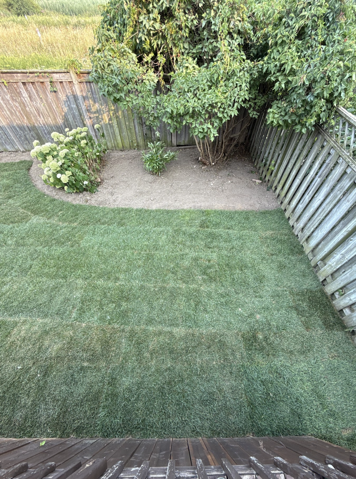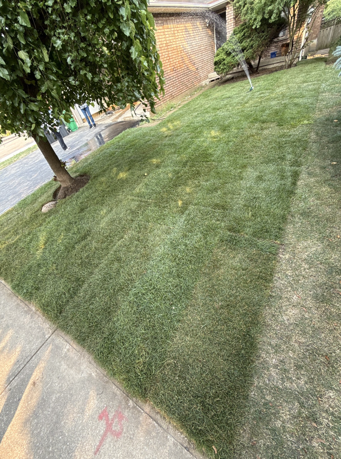 Sod Installation (Front Yard) – Fresh Kentucky Bluegrass sod was carefully installed for a lush, green lawn.