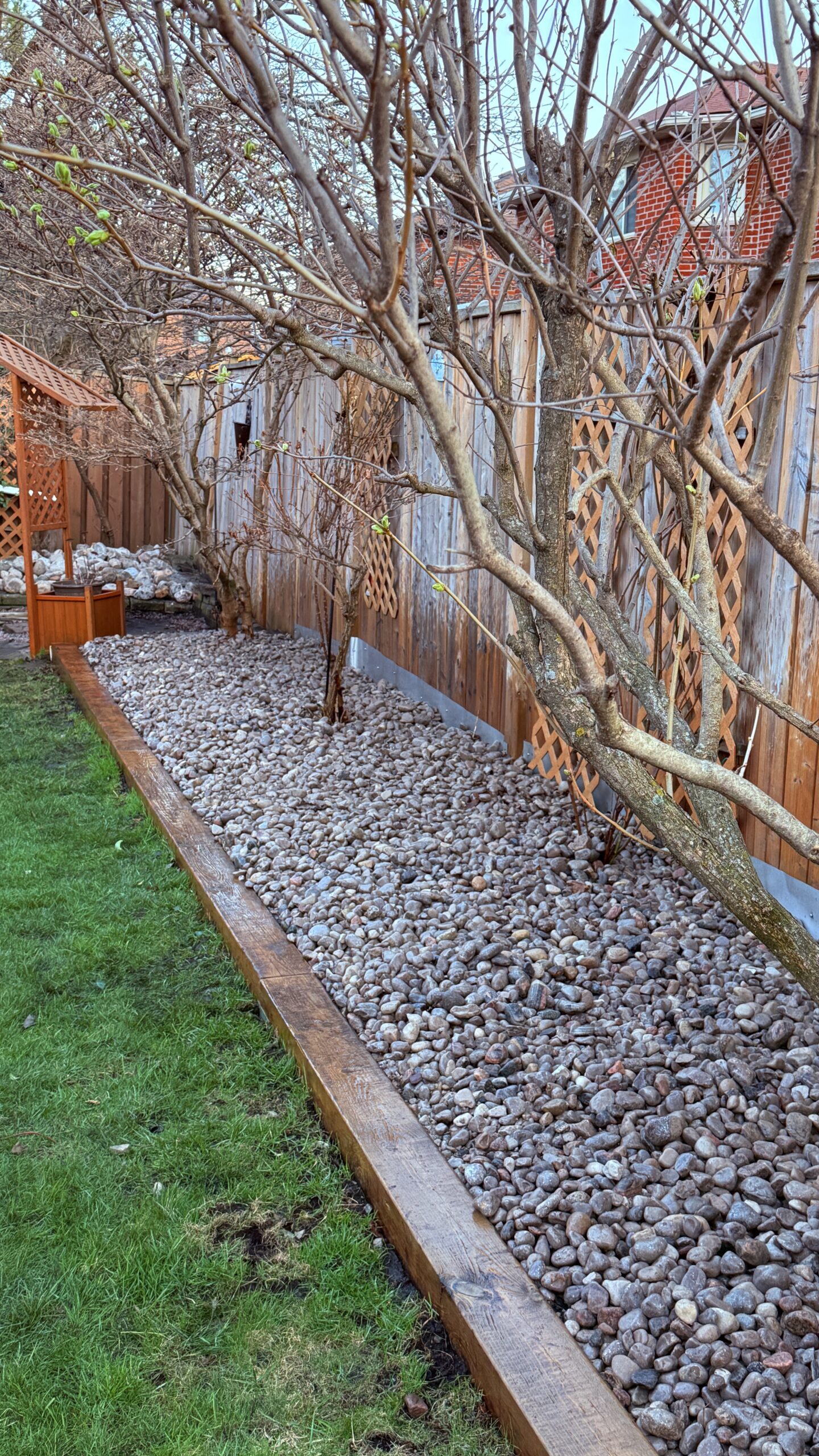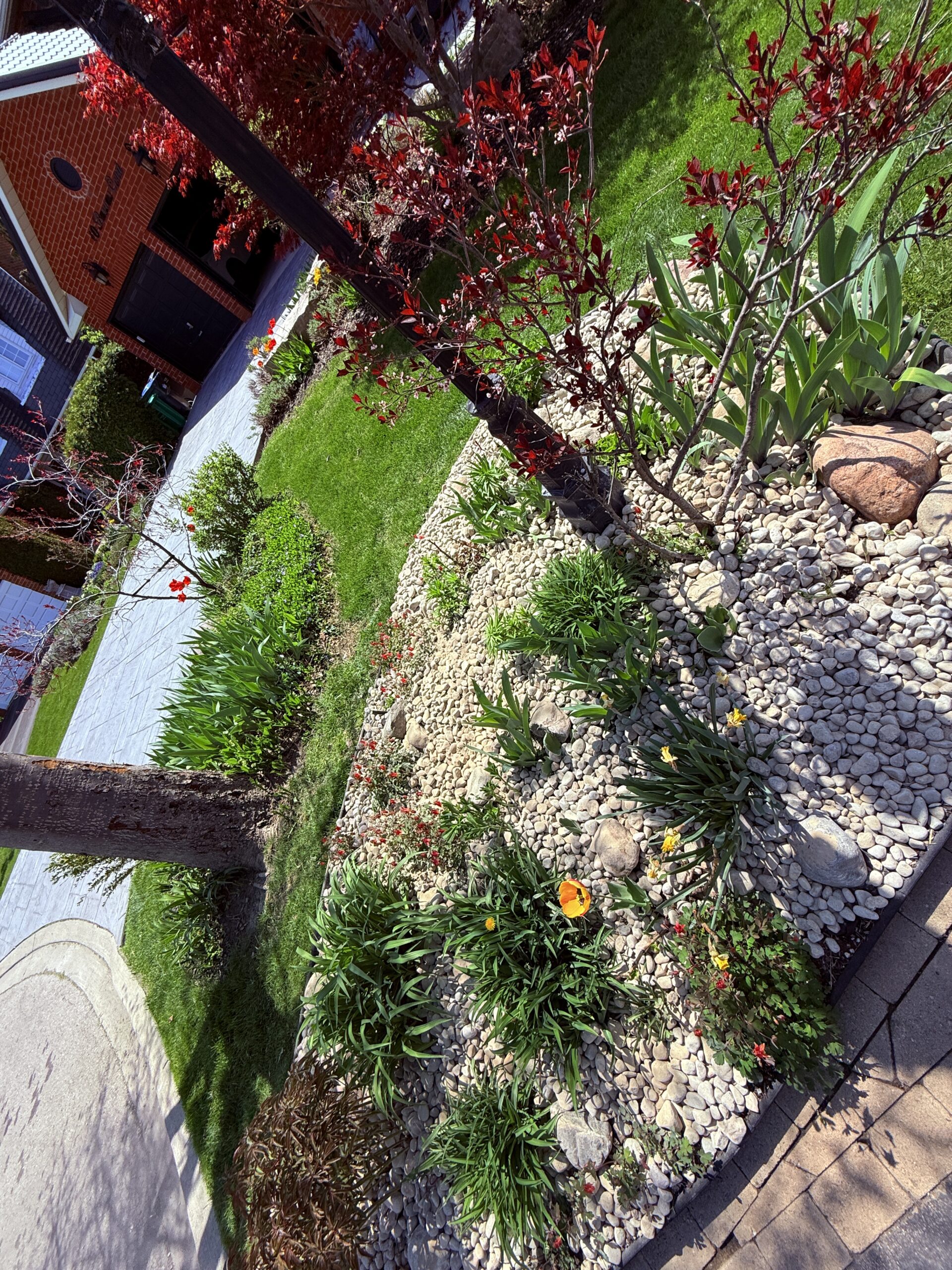 Our team started with a full spring cleanup, clearing debris, pruning overgrown areas, and removing unwanted vegetation to create a clean slate. Next came one of the most impactful stages — tree removal and new tree installation. Removing aging or misplaced trees not only improved the layout but also allowed more sunlight to reach the garden beds, promoting healthier growth for the new landscape design.